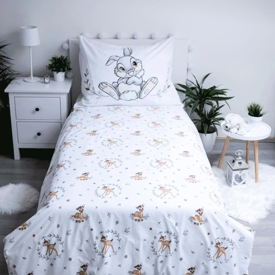 Disney Bambi Dekbedovertrek, Circle. Dit leuke dekbedovertrek van Bambi en Stampertje is een echte blikvanger voor de kinderkamer. Ben jij ook zo’n fan van deze lieve Disney dieren? Dan mag dit overtrek niet ontbreken in je collectie! Een mooi, tijdloos dessin met een dubbelzijdige print. Hierdoor kan er gevarieerd worden met het opmaken van het bed. Gemaakt van 100% katoen, waardoor het heerlijk zacht blijft aanvoelen. Een waanzinnig gaaf verjaardagscadeau om te geven én te krijgen. Ook leuk voor de feestdagen!